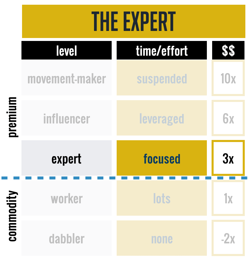 As THE EXPERT, you have a clear and deep understanding of your topic area and can get people positive results. This what most consider to be a “subject matter” expert. Someone that knows stuff. You’re in a great position and now need to focus on making sure the solutions and transformation you provide is distinct in the marketplace in order to stand out.